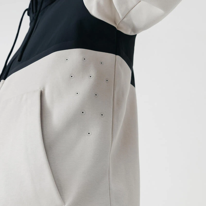 La partie du buste et épaules est protégée par un tissu déperlant qui permettra de courir sous une pluie fine et empêchera le vent de passer au travers de la veste. Grâce à cette partie déperlante, la veste pourra être utilisée sous plusieurs conditions climatiques.
